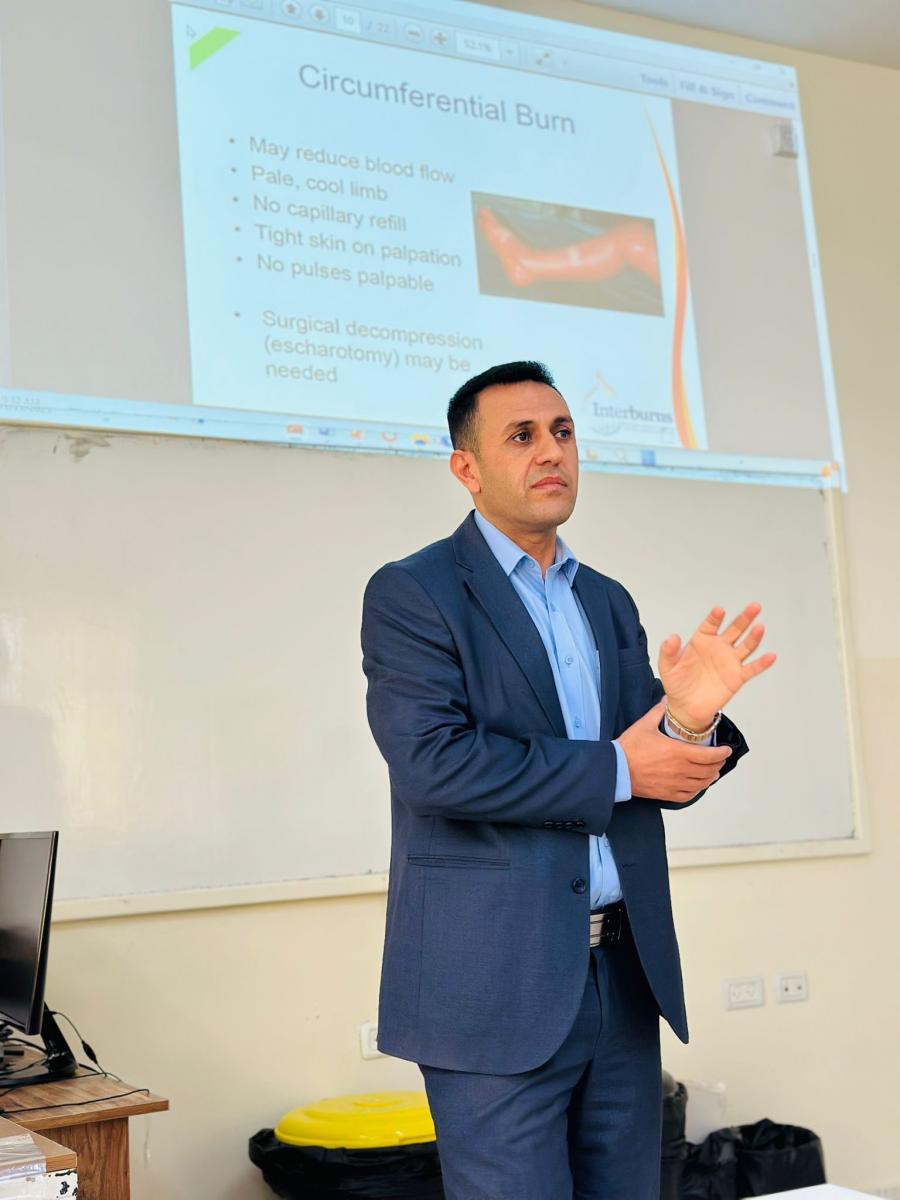 تناولت المحاضرة أحدث المفاهيم العلمية في التعامل مع حالات الحروق وأساليب الرعاية التمريضية المناسبة، وشهدت تفاعلًا مميزًا من الحضور ومناقشات أثرت الجانب العلمي والمهني.